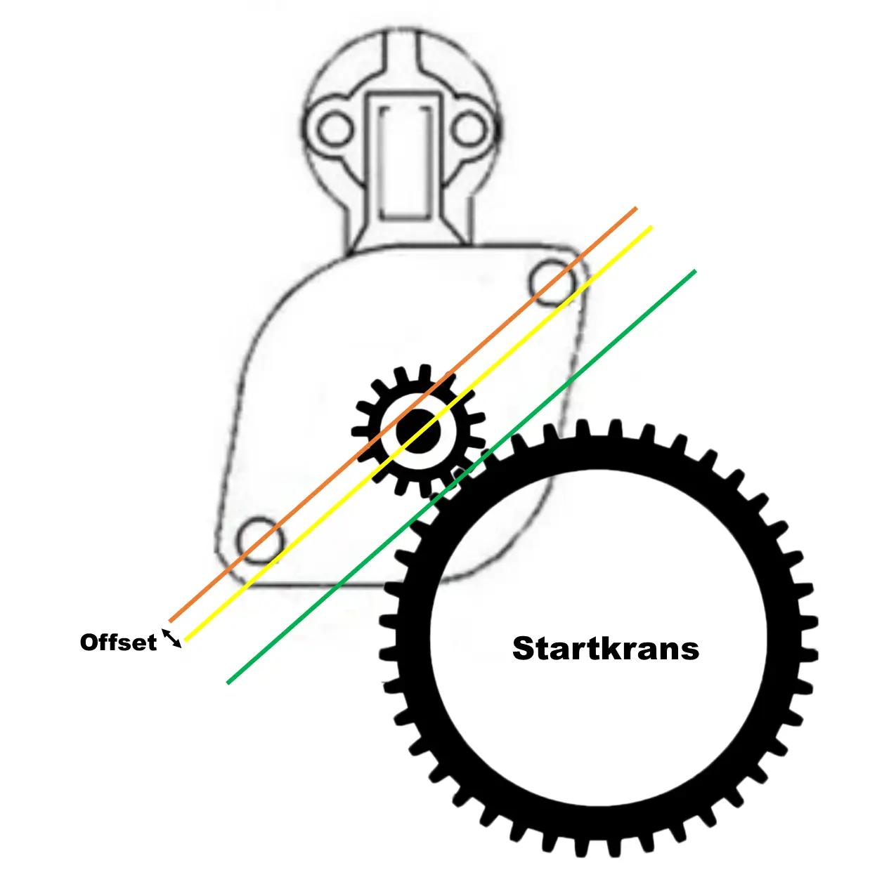 Ett sätt att kontrollera om dreven på två startmotorer kuggar i på samma ställe, är att mäta drevavståndet till startmotorernas monteringsfläns. Då tar man och placerar skjutmåttets bakkant mot startmotorns fläns, i den uppskattade vinkeln från startkransens centrum. Därefter skjuter man ut skjutmåttets mätsticka tills det når ett av drevets dalar. Sedan gör man likadant på den andra startmotorn och kontrollerar så att de har samma drevavstånd.
